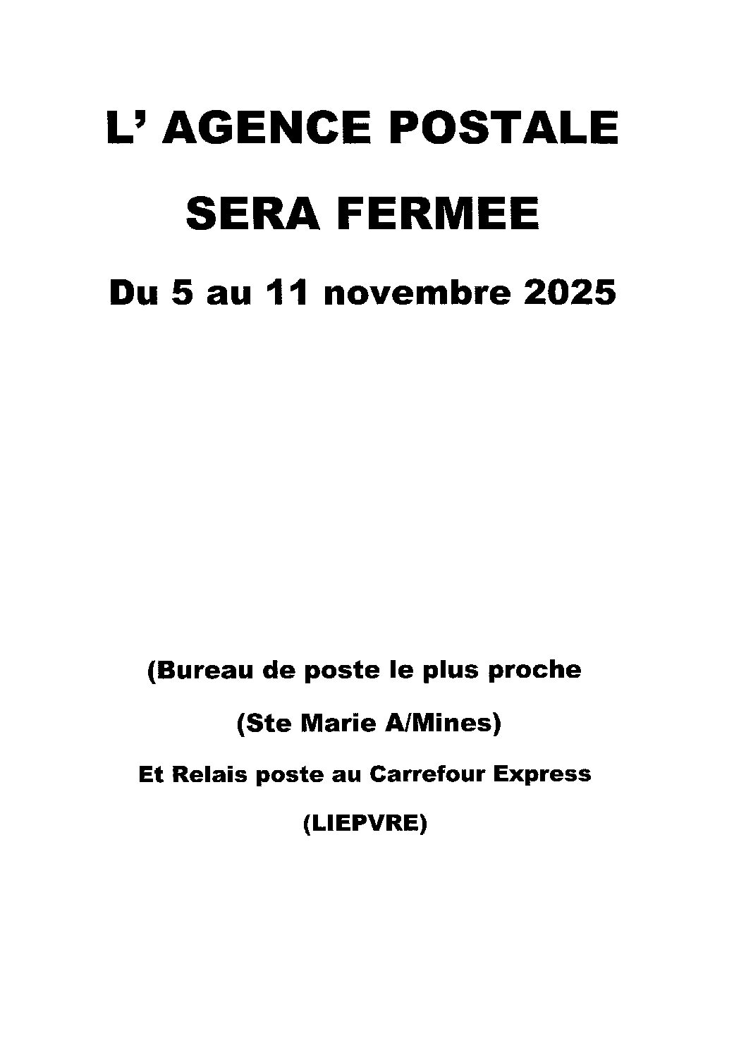 L’agence postale de Ste Croix-aux-Mines sera fermée du 5 au 11 novembre 2025