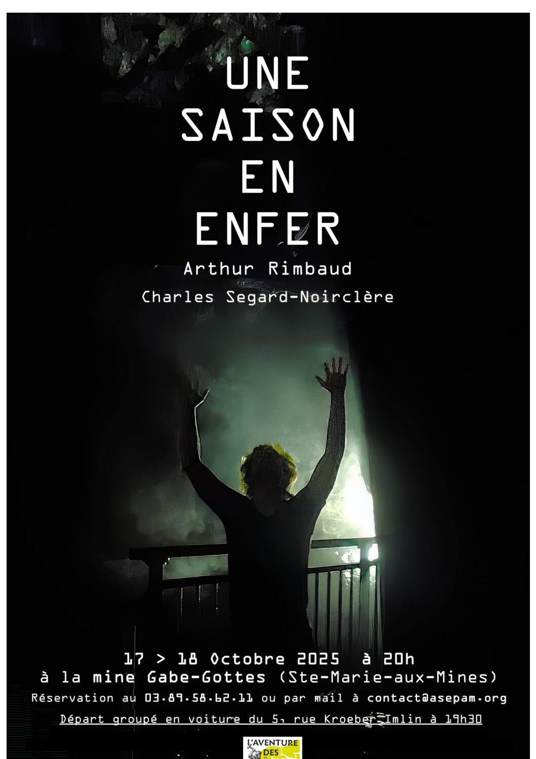 contact@asepam.org ou par téléphone au : 03 89 58 62 11 ou encore sur notre site : https://asepam.regiondo.fr/une-saison-en-enfer-arthur-rimbaud